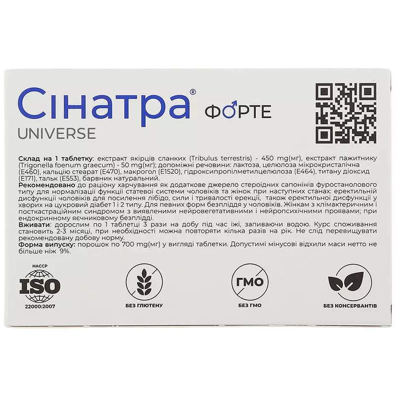 Рекомендації щодо вживання: до раціону харчування як продукт, що забезпечує організм стероїдними сапонінами фуростанолового типу, що містяться у складі екстракту якірців сланких та екстракту пажитнику для нормалізації функції статевої системи чоловіків та жінок. Спосіб застосування та рекомендована добова норма: дорослим по 1 таблетці 3 рази на добу під час їжі, запиваючи водою. Курс споживання становить 2 - 3 місяці, при необхідності можна повторювати кілька разів на рік. Не слід перевищувати рекомендовану добову норму. Перед прийомом продукту проконсультуватися з лікарем. Застереження: не вживати при індивідуальній чутливості до будь-якого компоненту продукту, при важких серцево-судинних і ниркових захворюваннях, період вагітності та годування груддю. Не рекомендується вживати підліткам віком до 18 років.Продукт не слід використовувати як заміну повноцінного раціону харчування. Різноманітне і збалансоване харчування та здоровий спосіб життя є важливими.
