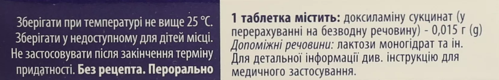 діюча речовина: 1 таблетка містить доксиламіну сукцинат (у перерахуванні на безводну речовину) - 0,015 г;