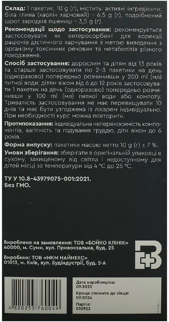 Рекомендації щодо застосування: Рекомендується застосовувати як ентеросорбент для корекції раціонів дієтичного харчування з метою виведення з організму токсичних речовин та метаболітів різного походження. Спосіб застосування: дорослим та дітям від 13 років та старше застосовувати по 2-3 пакетики на день (одноразово) попередньо розчинивши у 200 ml (мл) питної води; дітям віком від 6 до 12 років застосовувати 1 пакетик на день (одноразово) попередньо розчинивши у 100 ml (мл) питної води або компоту. Тривалість застосовування не має перевищувати 10 днів та має бути узгоджена із лікарем індивідуально. При необхідності курс можна повторити. Протипоказання: індивідуальна непереносимість компонентів, вагітність та годування груддю, діти віком до 6 років. Застереження щодо застосування: не перевищувати рекомендовану добову дозу, не слід використовувати як заміну повноцінного раціону.Дата виробництва: вказано на упаковці