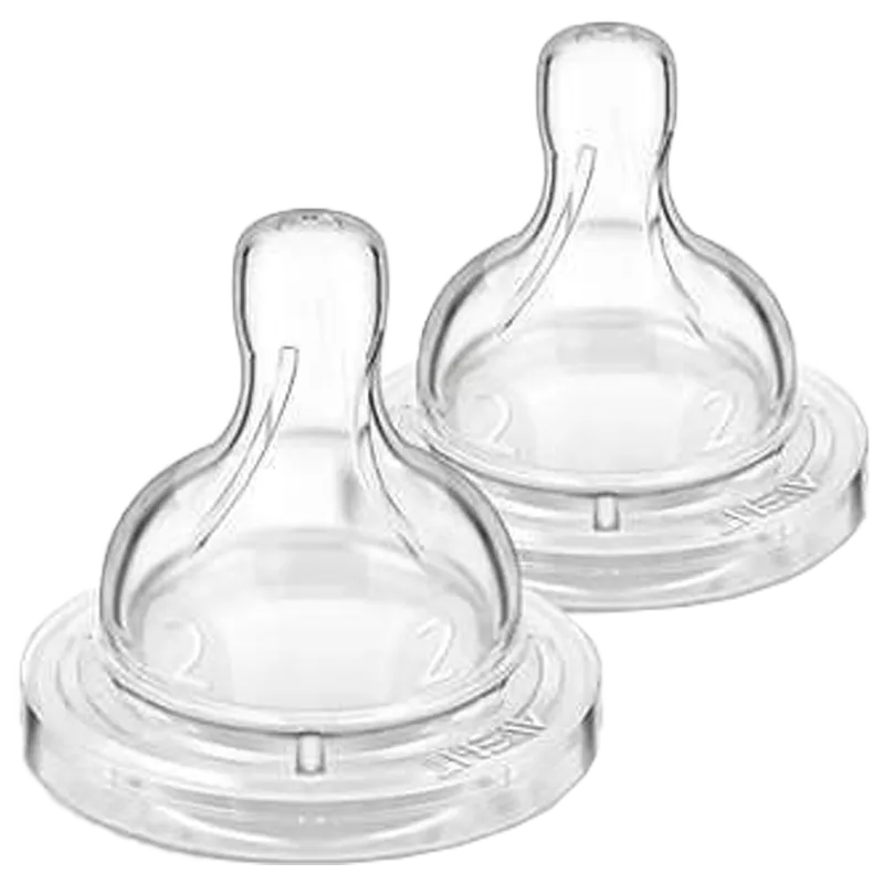 Лінійка пляшечок Philips Avent Anti-colic пропонує різні рівні інтенсивності потоку рідини соски відповідно до розвитку дитини. Пам’ятайте, що значення віку вказані приблизно, оскільки діти розвиваються по-різному. Усі соски доступні в подвійних упаковках: для новонароджених, з повільним, середнім, швидким, змінним потоком та для густої їжі.