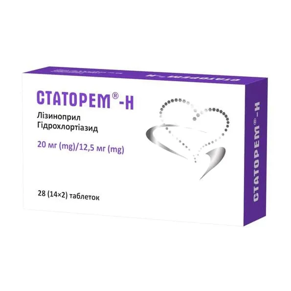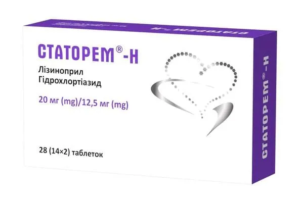 Статорем®-Н – це комбінований препарат із фіксованим дозуванням, який містить лізиноприл – інгібітор ангіотензинперетворювального ферменту (АПФ) та гідрохлортіазид (ГХТЗ) – тіазидний діуретик. Обидва компоненти мають тип дії та виявляють сумарний гіпотензивний ефект, що взаємодоповнюють один одного.