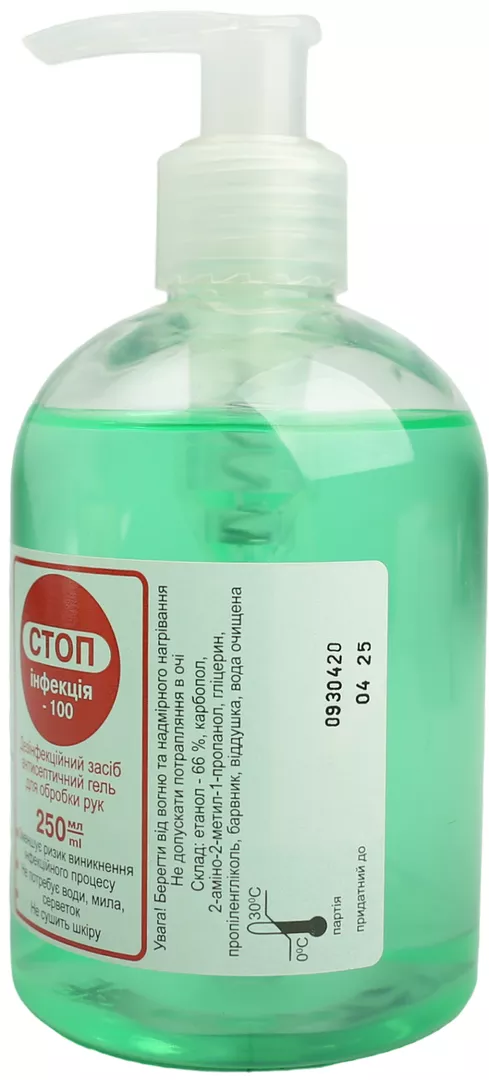 Дезінфекційний засіб антисептичний гель «СТОПінфекція-100» для обробки рук. Гель не вимагає розведення і готовий до застосування. Після обробки рук гель не змивати.