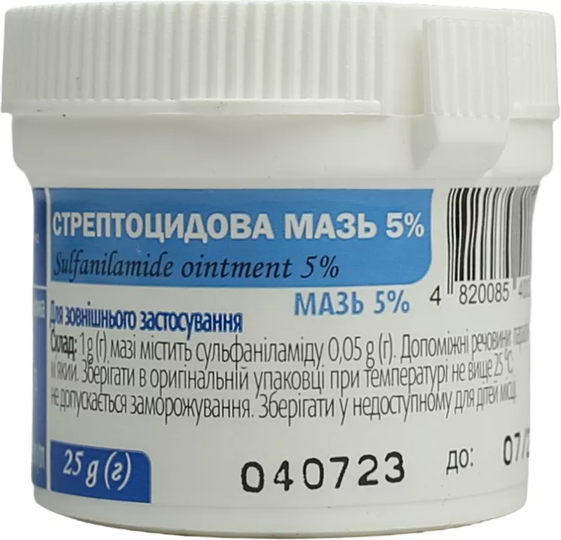Особливі застереження. Застосування у період вагітності або годування груддю. Протипоказане застосування препарату. Здатність впливати на швидкість реакції при керуванні автотранспортом або роботі з іншими механізмами. Не впливає. Діти. Безпека та ефективність застосування Стрептоцидової мазі дітям не встановлені, тому застосовувати препарат дітям не рекомендується. Спосіб застосування та дози. Стрептоцидову мазь наносить тонким шаром на уражену ділянку, у тому числі під марлеву пов'язку. Кратність та тривалість застосування визначається лікарем і залежить від тяжкості захворювання і досягнутого терапевтичного ефекту. Передозування. Можливе посилення проявів побічних реакцій. Побічні ефекти. Можливі алергічні реакції, включаючи дерматит, кропив’янку. Взаємодія з іншими лікарськими засобами та інші види взаємодій. Під час застосування Стрептоцидової мазі небажано приймати такі препарати як дигітоксин, кислоту хлористоводневу, кофеїн, мезатон, фенобарбітал, адреналіну гідрохлорид.Новокаїн, який містить залишок параамінобензойної кислоти, знижує ефективність препарату, якщо ці лікарські засоби застосовували одразу один за одним.