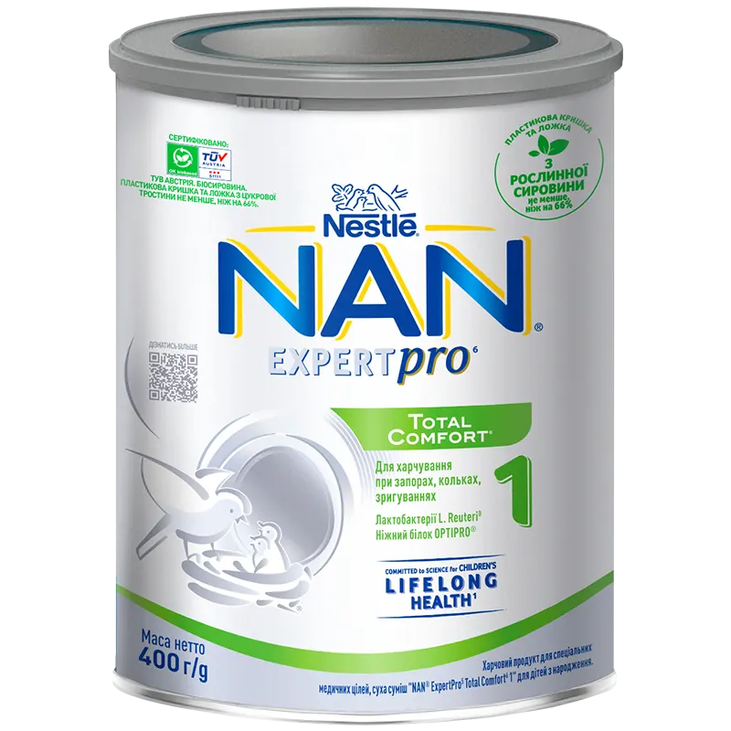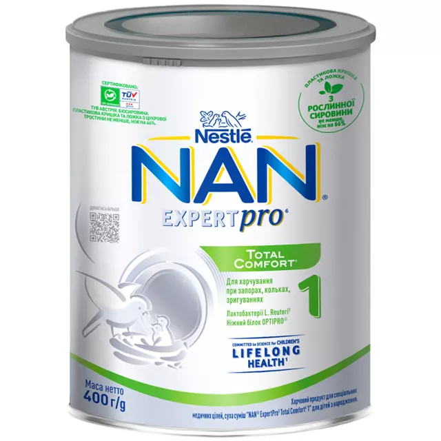Суха суміш "NAN® ExpertPro Total Comfort 1" для дітей з народження – це харчовий продукт для спеціальних медичних цілей, який підходить для використання як єдине джерело харчування від народження до введення прикорму. Суміш спеціально розроблена для харчування при симптомах чутливості кишечника: кольках, здутті, зригуваннях і закрепах та проблемах із випорожненням. Також містить необхідні поживні речовини для оптимального росту та розвитку.