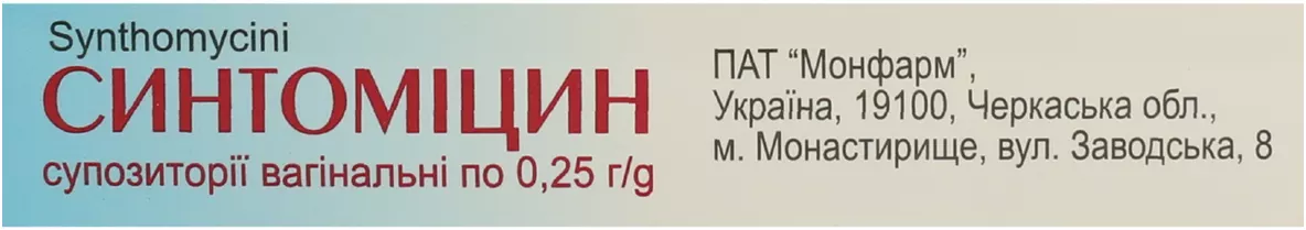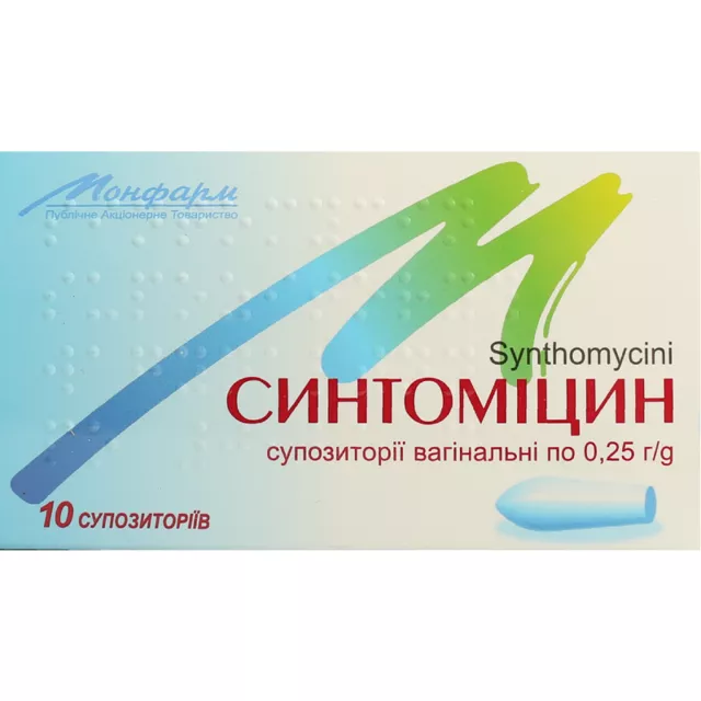 1 супозиторій містить синтоміцину 250 мг (0,25 г);