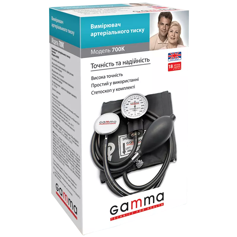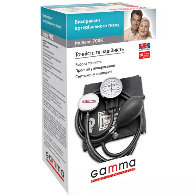 Механічний тонометр з манжетою на плече Gamma (Гамма) 700K застосовується як еталонний засіб вимірювання артеріального тиску, як у медичній практиці, так і в домашніх умовах. Механічний тонометр з манжетою на плече Gamma 700К сертифікований відповідно до європейських стандартів якості та пройшов необхідні клінічні дослідження.