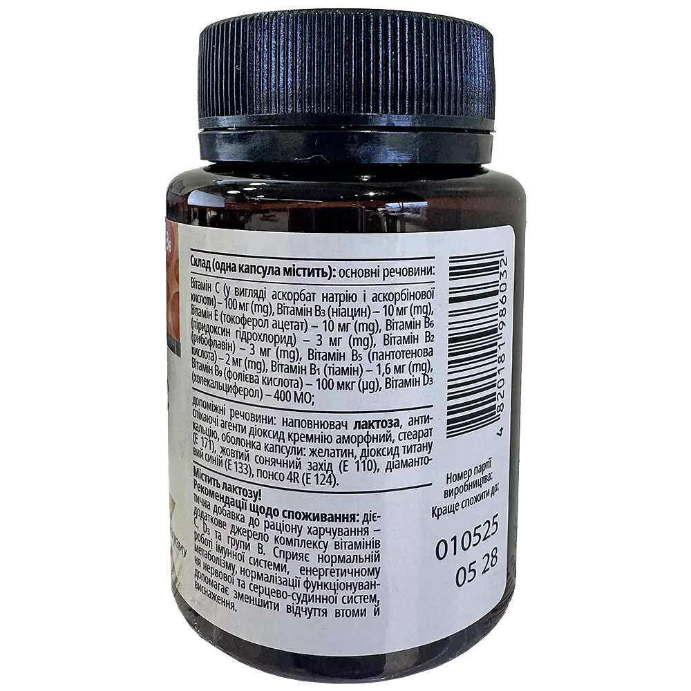 Склад, 1 капсула містить: основні речовини: Вітамін С (у вигляді аскорбат натрію і аскорбінової кислоти) - 100 мг (mg), Вітамін В3 (ніацин) – 10 мг (mg), Вітамін Е (токоферол ацетат) – 10 мг (mg), Вітамін В6 (піридоксин гідрохлорид) – 3 мг (mg), Вітамін В2 (рибофлавін) - 3 мг (mg), Вітамін В5 (пантотенова кислота) – 2 мг (mg), Вітамінв В1 (тіамін) – 1,6 мг (mg), Вітамін В9(фолієва кислота) – 100 мкг (μg), Вітамін D3 (холекальциферол) – 400 МО;допоміжні речовини: наповнювач лактоза, антиспікаючі агенти діоксид кремнію аморфний, стеарат кальцію, оболонка капсули: желатин, діоксид титану (Е 171), жовтий сонячний захід (Е 110), діамантовий синій (Е 133), понсо 4R (Е 124).