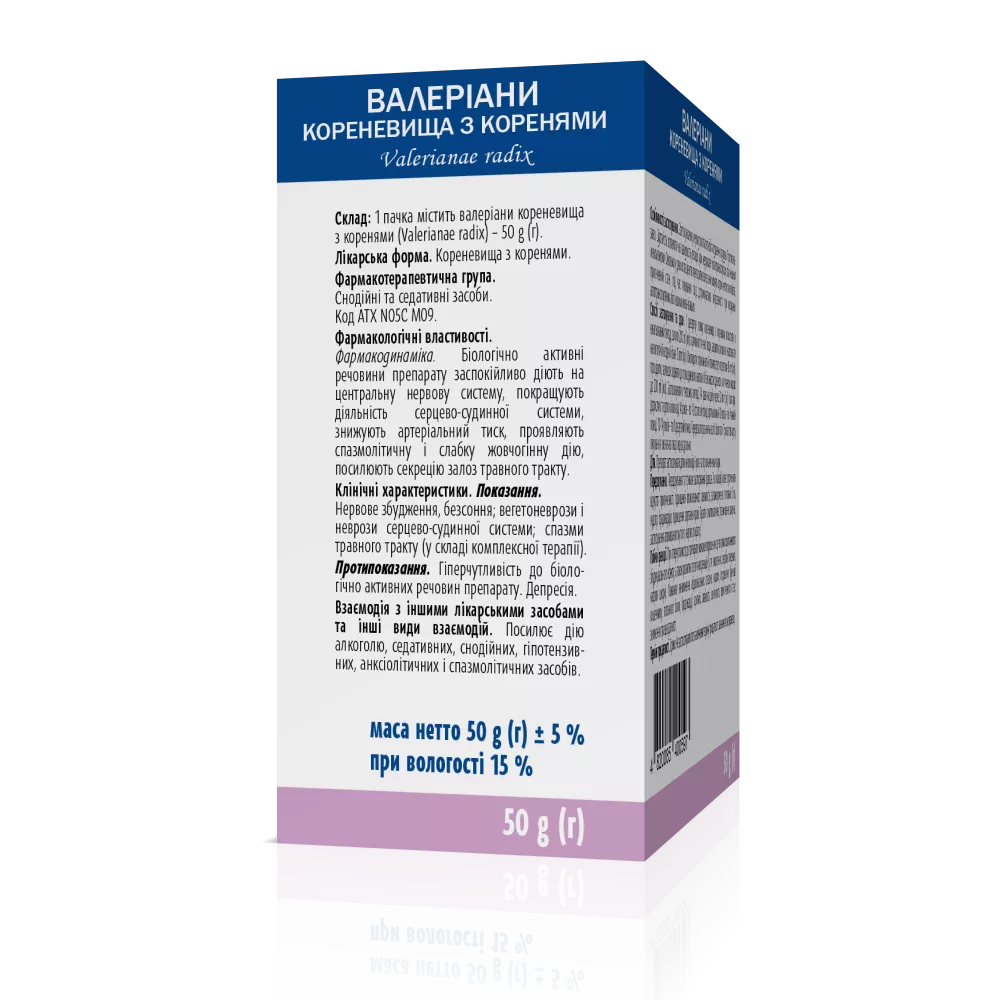 1 пачка містить кореневища з коренями валеріани лікарської (Valerianae radix) – 50 г; 1 фільтр-пакет містить кореневища з коренями валеріани лікарської (Valerianae radix) – 1,5 г.