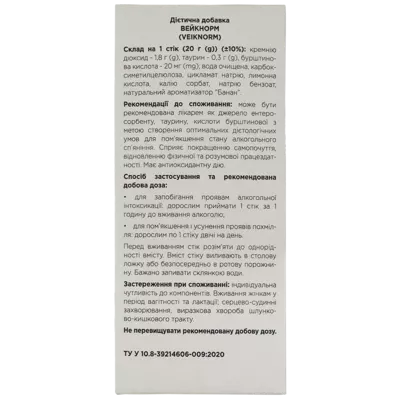 на 1 стік (20 г (g)) (±10%): кремнію діоксид – 1,8 г (g), таурин – 0,3 г (g), бурштинова кислота – 20 мг (mg); вода очищена, карбоксиметилцелюлоза, цикламат натрію, лимонна кислота, калію сорбат, натрію бензоат, натуральний ароматизатор «Банан».