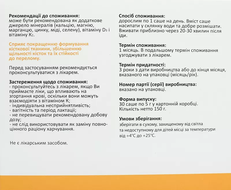 Рекомендації до споживання: може бути рекомендована як додаткове джерело мінералів (кальцію, магнію, марганцю, цинку, міді, селену), вітаміну D3 і вітаміну К2.Сприяє покращенню формування кісткової тканини, збільшенню щiльностi кісток та їх стiйкостi