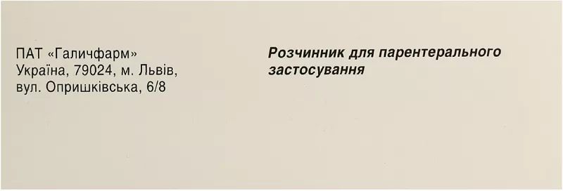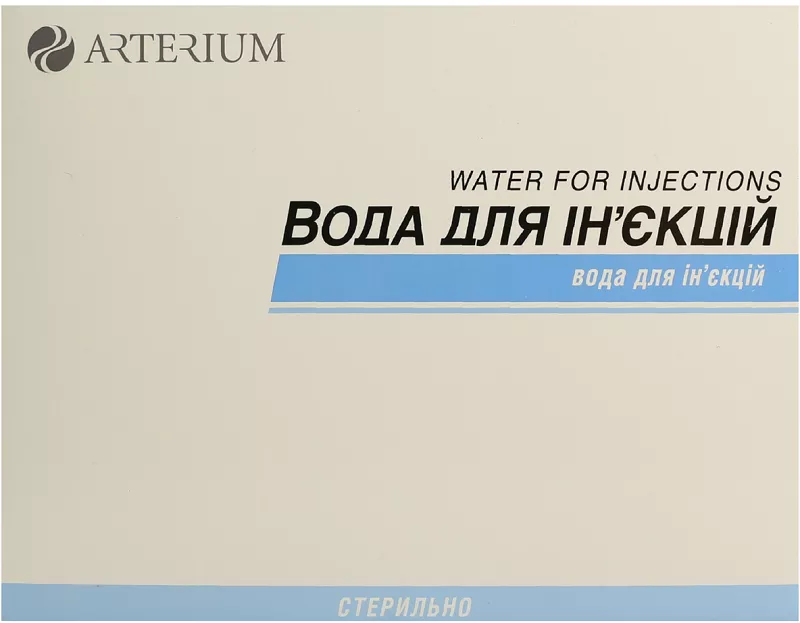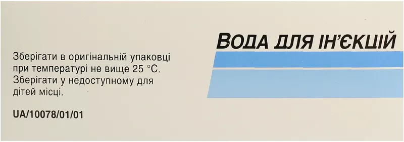Показання. Воду для ін’єкцій застосовувати для приготування стерильних розчинів лікарських і діагностичних засобів, призначених для підшкірного, внутрішньом’язового, внутрішньовенного введення. Протипоказання. Воду для ін’єкцій як розчинник лікарських і діагностичних препаратів не застосовувати, якщо в інструкції для медичного застосування препарату зазначений інший розчинник. Не застосовувати препарат для промивання очей при офтальмологічних операціях. Взаємодія з іншими лікарськими засобами та інші види взаємодій. Вода для ін’єкцій не проявляє фармакологічної або хімічної взаємодії з лікарськими та діагностичними засобами, призначеними для підшкірного, внутрішньом’язового або внутрішньовенного введення. Особливості застосування. Вода для ін’єкцій призначена лише для приготування стерильних розчинів лікарських і діагностичних засобів, призначених для підшкірного, внутрішньом’язового або внутрішньовенного введення, у способі застосування яких передбачене застосування води для ін’єкцій. Воду для ін’єкцій не можна безпосередньо ввести внутрішньосудинно через низький осмотичний тиск у зв’язку з ризиком виникнення гемолізу! Застосування у період вагітності або годування груддю. Можливо застосовувати у період вагітності або годування груддю. Здатність впливати на швидкість реакції при керуванні автотранспортом або іншими механізмами. Не впливає. Спосіб застосування та дози. Приготування розчинів лікарських та діагностичних засобів з використанням води для ін’єкцій здійснюється в асептичних умовах (відкриття ампул, наповнення водою шприца та ємностей з лікарськими засобами). Кількість води для ін’єкцій з метою приготування розчину лікарського засобу визначається інструкцією для медичного застосування останнього. Діти. Можливо застосувавати у педіатричній практиці. Передозування. Не описано. Побічні реакції. Не описані. Термін придатності. 4 роки. Умови зберігання. Зберігати в оригінальній упаковці при температурі не вище 25 0С. Зберігати у недоступному для дітей місці. Упаковка. По 2 мл в ампулі, по 10 ампул у блістері, по 1 блістеру в пачці;по 5 мл в ампулі, по 5 ампул у блістері, по 2 блістери в пачці.