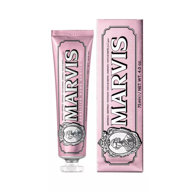 Спеціально розроблена для чутливих ясен, зубна паста Marvis поєднує в собі неперевершений аромат, ніжну текстуру та ефективну формулу. Абсолютно нова формула, яка забезпечує відмінну гігієну порожнини рота, делікатно очищає і надає догляд за чутливими яснами завдяки спеціальним активним компонентам: гіалуронової кислоти і пребіотикам. Гіалуронова кислота - зволожує, захищає і надає загальнозміцнюючу дію. Пребіотики заспокоюють ясна, сприяють більш швидкій регенерації тканин. Крім того, ефективність формули посилюється наявністю компонента Алантоїн, який сприяє загоєнню ясен і зменшує їх кровоточивість. Фтор 0,25% протидіє карієсу і утворенню нальоту. В результаті спостерігається помітне полегшення і зменшення кровоточивості ясен вже після першого використання.
