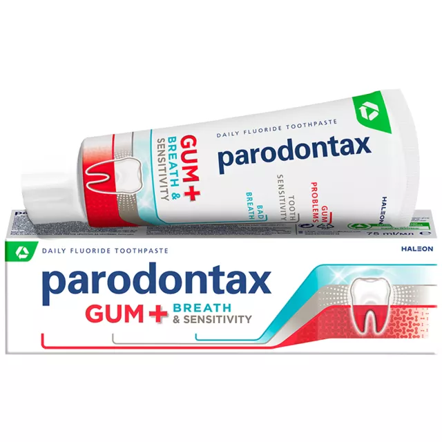Зубна паста Пародонтакс Захист Ясен + Свіжий Подих і Чутливість Зубів допомагає вирішити проблеми кровоточивості ясен, чутливості твердих тканин зуба та неприємного запаху. 46% споживачів, що мають проблеми з яснами, мають також проблеми з чутливістю зубів та неприємним запахом. Технологія «pro-neutra» у складі зубної пасти нейтралізує та видаляє бактерії, які викликають неприємний запах з рота. Компоненти у складі олово та цинк забезпечують потрібний ефект. Містить фтор. Завжди дотримуйтесь рекомендацій щодо застосування, вказаних на упаковці. Чистити зуби двічі на день, але не більше трьох. Не застосовувати дітям віком до 12 років, якщо інше не рекомендовано стоматологом. У випадку появи подразнення припиніть застосування.