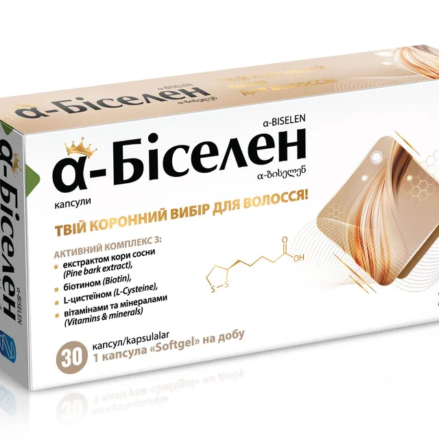Альфа-биселен – диетическая добавка, содержащая комплекс антиоксидантов, витаминов, минералов, аминокислот и биофлавоноидов. В состав активных компонентов входят экстракт коры сосны, альфа-липоевая кислота, витамины С, Е, группы B (в т.ч. биотин), цинк, железо, селен, а также гидролизат коллагена, аминокислоты и растительные экстракты. Комбинация этих веществ способствует синтезу эндогенного коллагена, поддержанию нормального состояния кожи, волос, ногтей, а также общему укреплению организма. Благодаря антиоксидантным свойствам и участию в энергетическом метаболизме, добавка помогает снизить негативное влияние стрессовых факторов окружающей среды, способствует нормализации обмена веществ и сохранению репродуктивного здоровья.