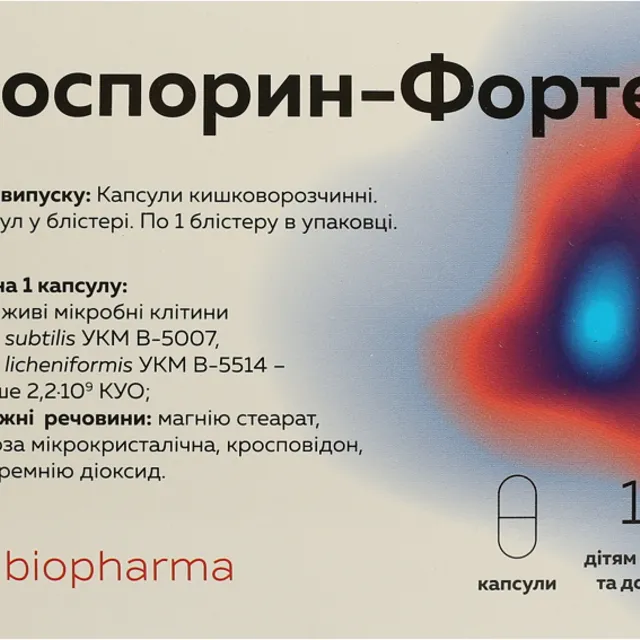 - Биоспорин форте капсулы, каждая из которых содержит не менее 2,2-109 КОЕ Bacillus subtilis УКМ В-5007 и Bacillus licheniformis УКМ В-5514.