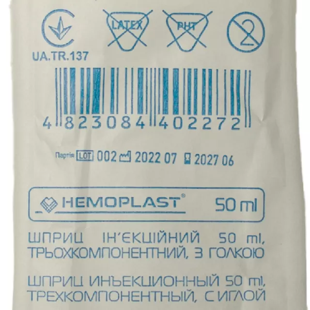Шприц 50 мл перфузионный одноразовый трехкомпонентный Луер-Лок с иглой (0,8 мм*38 мм) Гемопласт 1 шт | 18 ₴ |