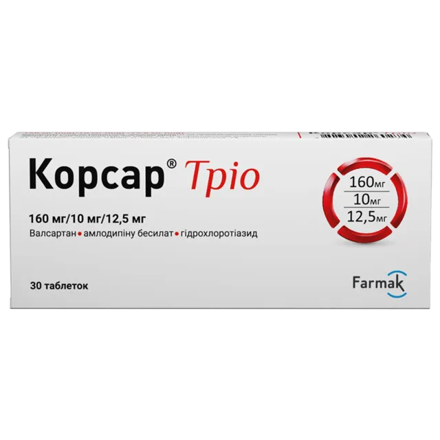 | Корсар Трио таблетки покрытые оболочкой 160 мг/10 мг/12,5 мг №30 | 268 ₴ |
