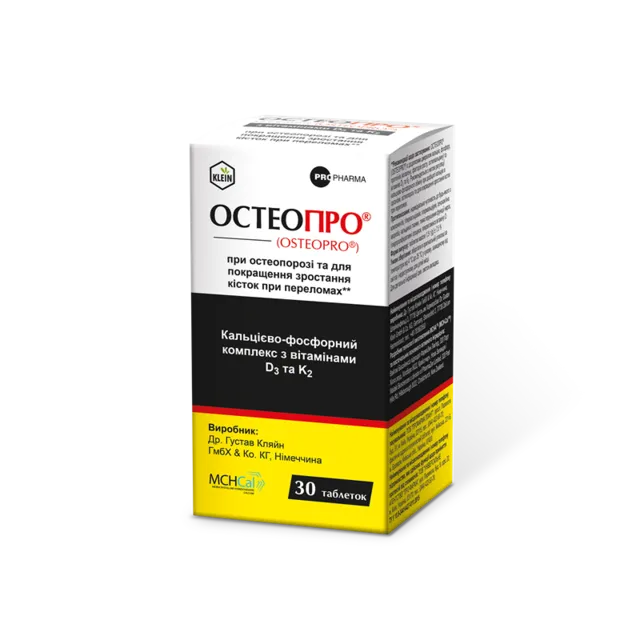 Остеопро – это диетическая добавка, содержащая кальциево-фосфорный комплекс и витамины D3 и K2. Она способствует поддержанию нормальных процессов в костной ткани. Основным компонентом препарата является микрокристаллический гидроксиапатитный комплекс МСНАтм (МСН-Саlтм), в составе которого есть минеральная и органическая составляющие.