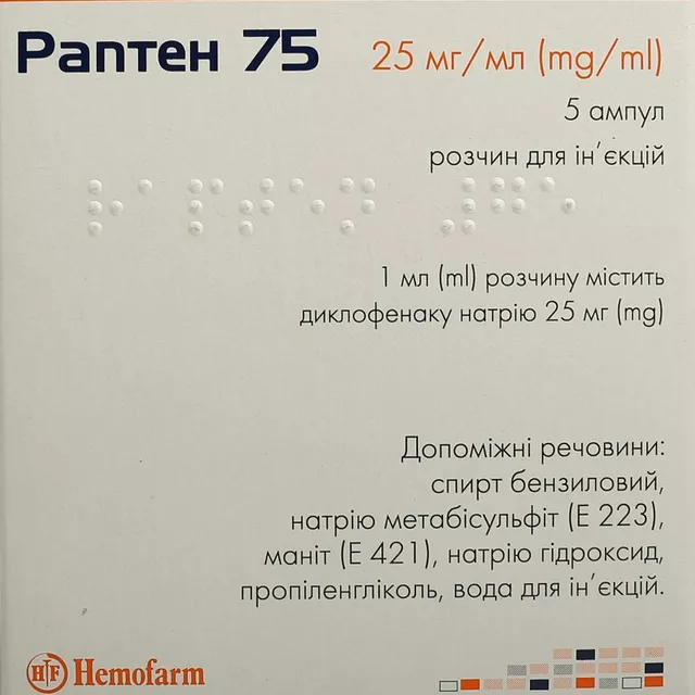 Форма выпуска препарата – раствор для инъекций по 3 мл в ампуле, в 1 мл которого содержится 25 мг диклофенака натрия. Прилагаемая к препарату Раптен 75 инструкция отмечает, что по физико-химическим свойствам раствор прозрачный, бесцветный или бледно-желтый с характерным запахом.