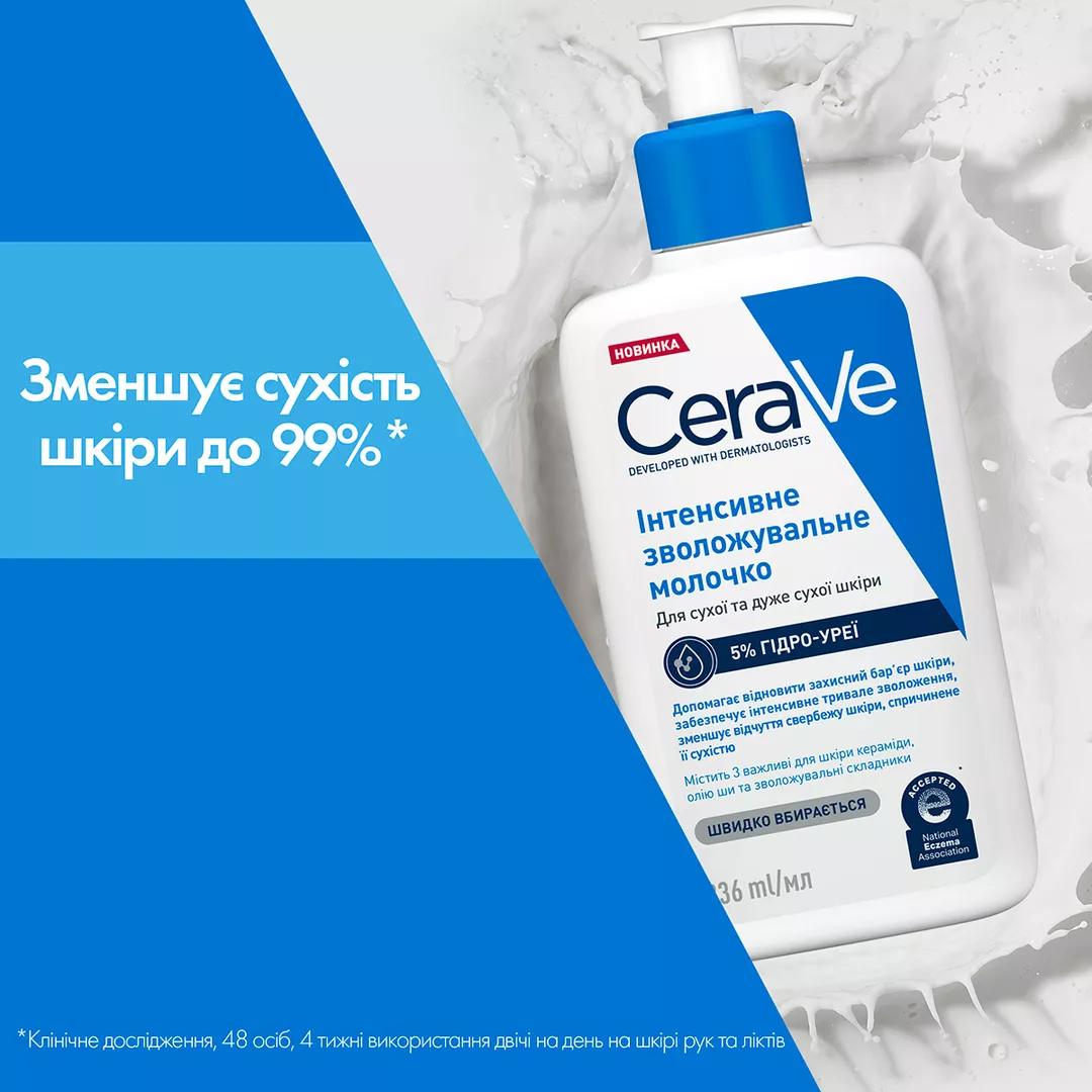 Аби повсякденний догляд компенсував усі вимоги та потреби вашої шкіри, необхідно подбати про оптимальне зволоження. Бренд CeraVe пропонує інтенсивно зволожувальне молочко для сухої та дуже сухої шкіри обличчя і тіла, чия формула збагачена 5% гідро-уреї та керамідами. Ці компоненти допомагають відновити захисний бар'єр шкіри і підтримують його цілісність при регулярному використанні засобу. Запатентована технологія MVE забезпечує тривале зволоження без зайвого навантаження на пори. Вона залишає відчуття комфорту та запобігає випаровуванню вологи незалежно від зовнішніх факторів.