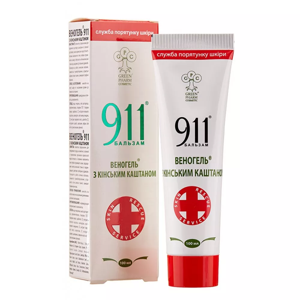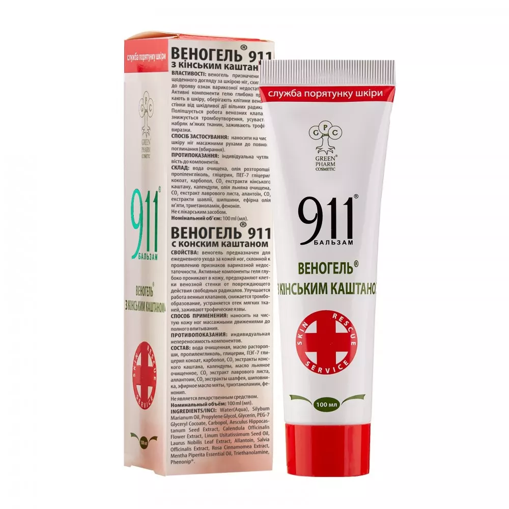 Веногель 911 з кінським каштаном застосовується для догляду за шкірою ніг з проявами варикозу. За рахунок активного рослинного складу Веногель 911 запобігає пошкодженню клітин венозних стінок, зміцнює їх, а також покращує роботу венозних клапанів. При регулярному використанні зменшується процес утворення тромбів, зменшуються набряки, швидше загоюються трофічні виразки. Гіпоалергенний.