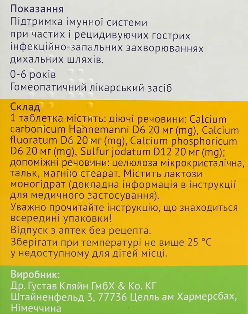 Склад:діючі речовини:1 таблетка містить Calcium carbonicum Hahnemanni D6 20 мг, Calcium fluoratum D6 20 мг, Calcium phosphoricum D6 20 мг, Sulfur jodatum D12 20 мг;