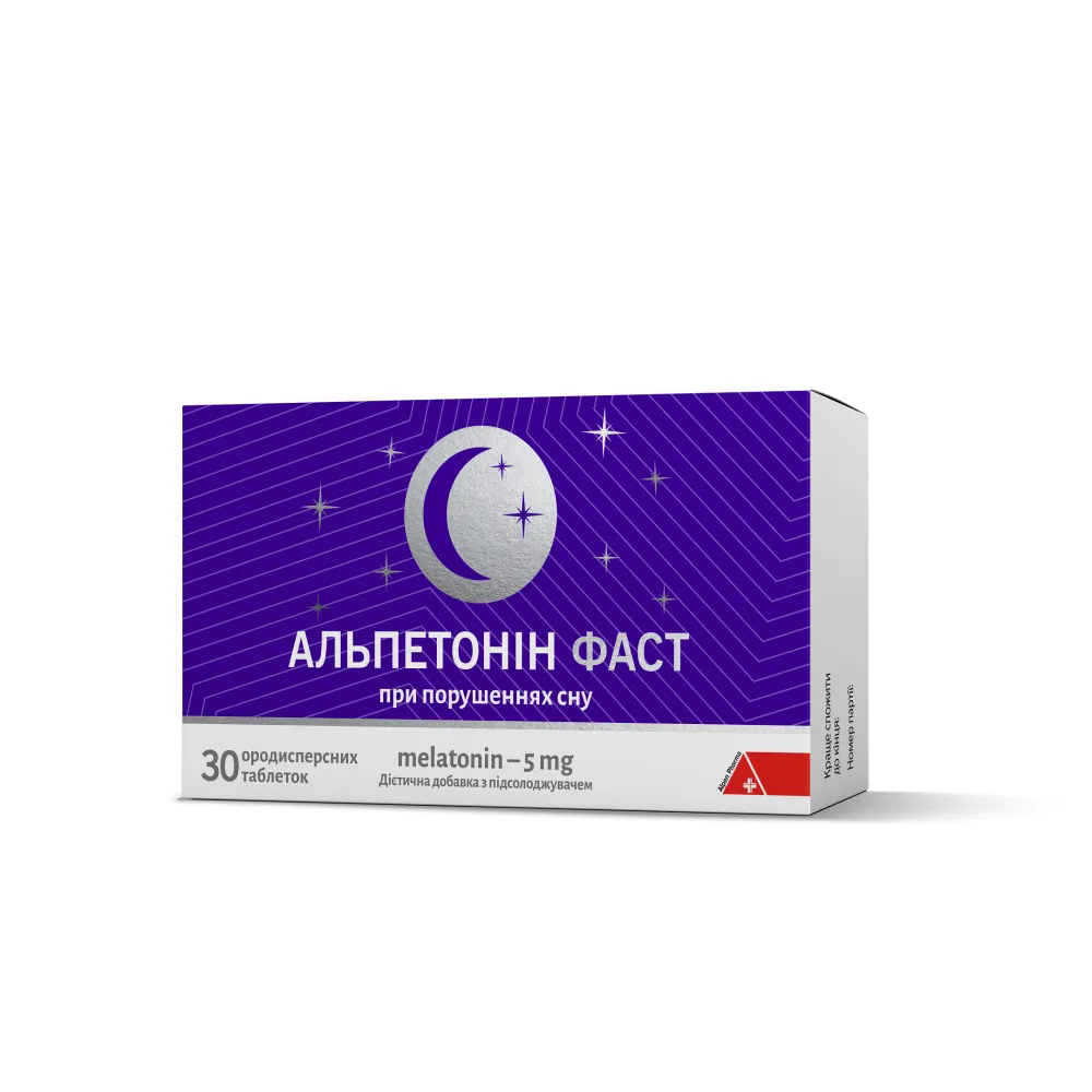 АЛЬПЕТОНІН ФАСТ – дієтична добавка до раціону харчування, яка може бути рекомендована в якості додаткового джерела мелатоніну, що сприяє підтримці здорового сну при ускладненому засинанні, частому нічному пробудженні та інших розладах сну, розладу циркадного ритму «сон-безсоння» при зміні часових поясів та при зміні зимового та літнього часу, при стресах та психо-емоційних навантаженнях, при погіршенні загального самопочуття та концентрації уваги, при хронічній втомі, при зменшенні розумової та фізичної працездатності та при змінах погодних умов у метеочутливих людей.
