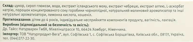 Склад: цукор; глюкозний сироп; вода питна, регулятор кислотності лимонна кислота, натуральний ароматизатор малини, екстракт ісландського моху (Cetrania islandica (L)), L-аскорбат натрію (вітамін С), порошок концентрованого соку горобини, екстракт чебрецю (Thymus vulgaris L.), екстракт алтею (Althаea officinalis L.), барвник кармін.