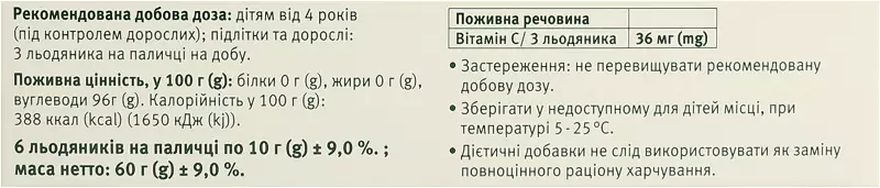 Вміст на 3 льодяники: вітамін С 36 мг (mg) %PBC* 45, екстракт ісландського моху 41,4 мг (mg), екстракт чебрецю 18 мг (mg), екстракт алтею 8,1 мг (mg)
