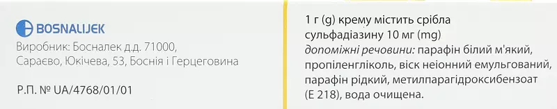 склад на 1 одиницю лікарської форми: 1 г крему містить срібла сульфадіазину 10 мг;