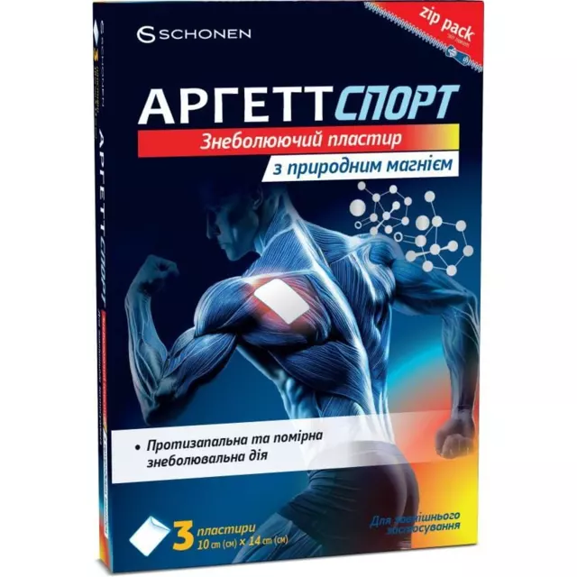 АРГЕТТ СПОРТ знеболюючий пластир з природним магнієм за рахунок еластичних властивостей основи призначений для фіксації уражених ділянок м’язу або суглобу. Камфора 3,1% сприяє симптоматичному тимчасовому полегшенню болю, пов’язаного із запаленням сухожиль, зв’язок, м’язів та суглобів травматичного походження, при розтягненнях зв’язок та сухожиль, вивихах, синцях, болю в суглобах, спині, шиї та попереку у дорослих та дітей віком від 12 років.