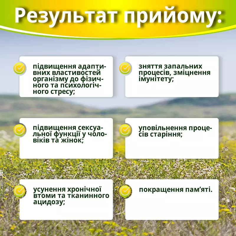 Активні компоненти сприяють:підвищенню адаптивних властивостей організму до фізичного і психологічного стресу;