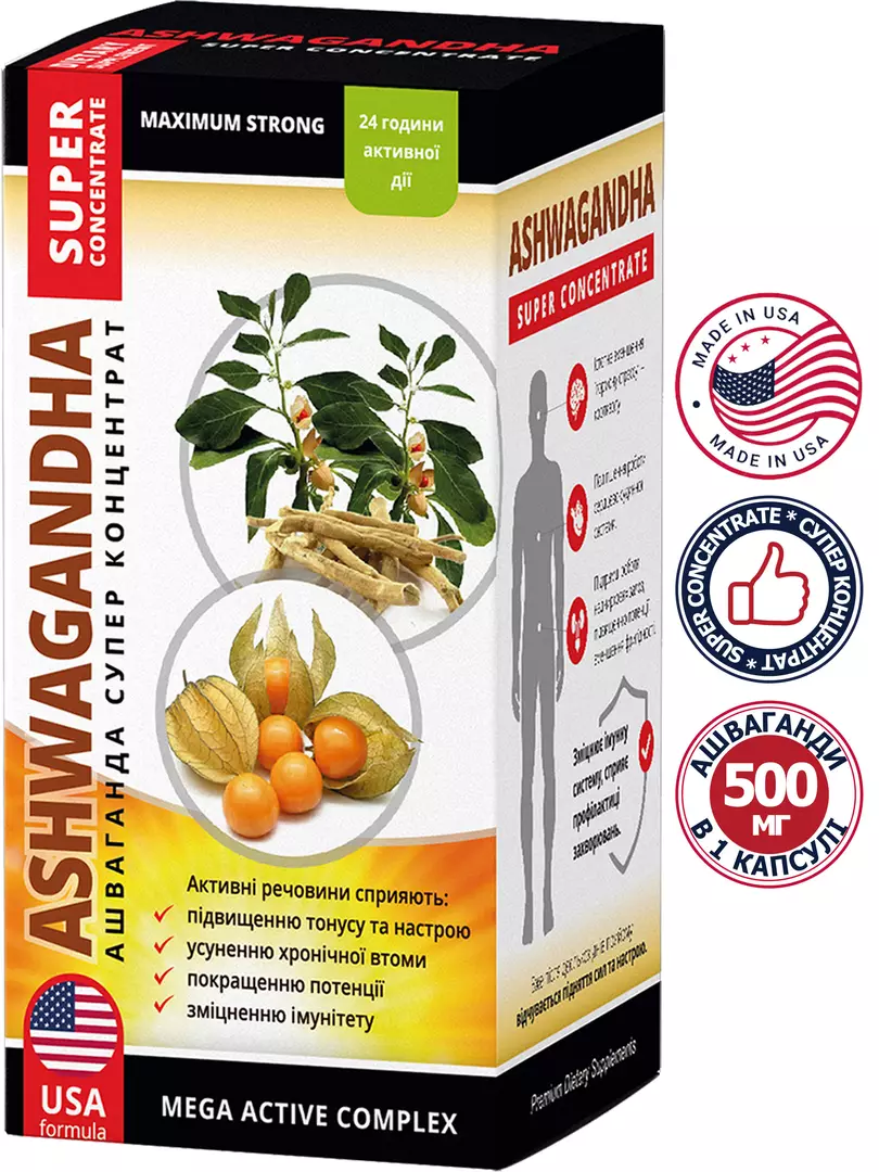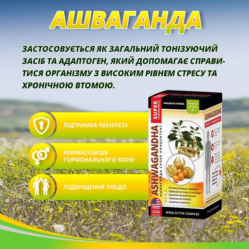 У традиційній аюрведичній медицині, "Ашваганда" протягом більш ніж двох тисячоліть застосовується в якості загального тонізуючого засобу та "адаптогену", який допомагає організму впоратися з високим рівнем стресу і хронічної втомою. Крім того, наукові дані доводять, що "Ашваганда" підтримує імунітет, нормалізує гормональні функції і підвищує лібідо як у чоловіків, так і у жінок.