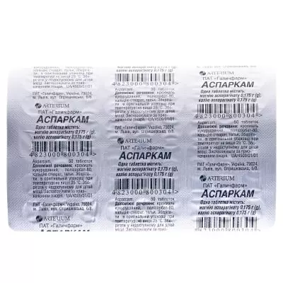 (ASPARСAM Arterium) Склад:діючі речовини: 1 таблетка містить магнію аспарагінату 0,175 г; калію аспарагінату 0,175 г;