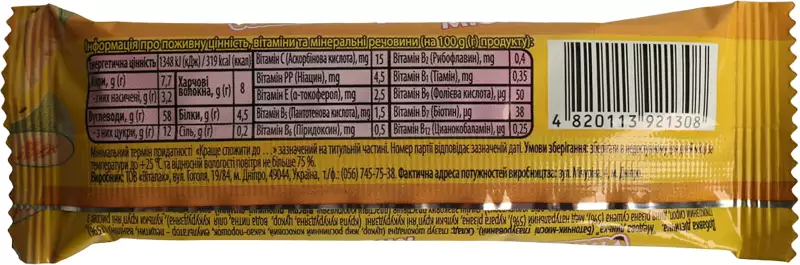 Опис:Батончик-мюслі з рисових кульок, пластівців і цукатів на подушці з білого шоколаду. Здорова їжа, яка є джерелом енергії перед будь-яким фізичним навантаженням. Мюслі містять клітковину, білок, вітаміни, мікроелементи - основу збалансованого харчування.