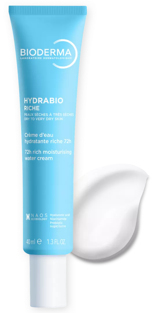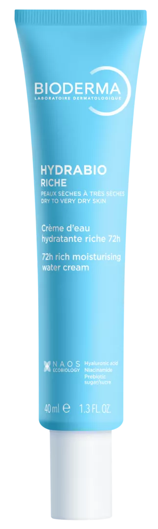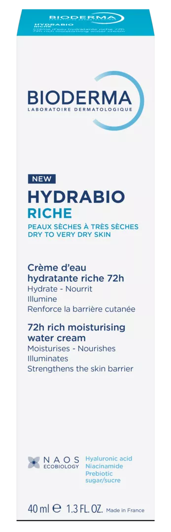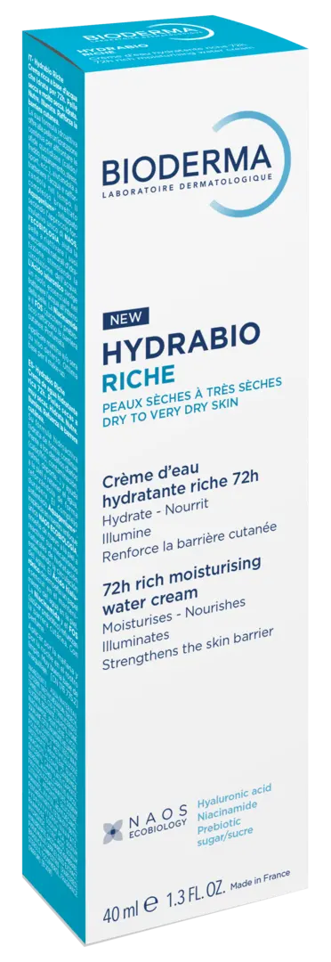 Гідрабіо Ріш насичений крем - це зволожувальний водний крем для сухої та дуже сухої шкіри, що забезпечує 72-годинну активність. Його гідроактивна формула забезпечує безперервне зволоження для боротьби з щоденними викликами (спекотна/холодна погода, забруднення, стрес, спорт...) та допомагає шкірі утримувати воду, зміцнюючи. Запатентований комплекс Aquagenium+*, натхненний нашим унікальним підходом НАОС ЕКОБІОЛОГІЯ, допомагає шкірі відновити свої природні механізми зволоження, стимулюючи циркуляцію води. Біоміметична гіалуронова кислота з високою молекулярною масою відіграє важливу роль в утриманні води в шкірі. Ніацинамід та пребіотичний цукор зміцнюють шкірний бар'єр. Насичена текстура, яка перетворюється на воду. Нелипкий, нежирний. Містить ароматизатор. Протестовано під дерматологічним контролем.