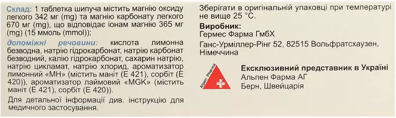 Склад лікарського засобу:діючі речовини: 1 таблетка шипуча містить: магнію оксиду легкого 342 мг і магнію карбонату легкого 670 мг, що відповідає іонам магнію 365 мг (=3D15 ммоль);