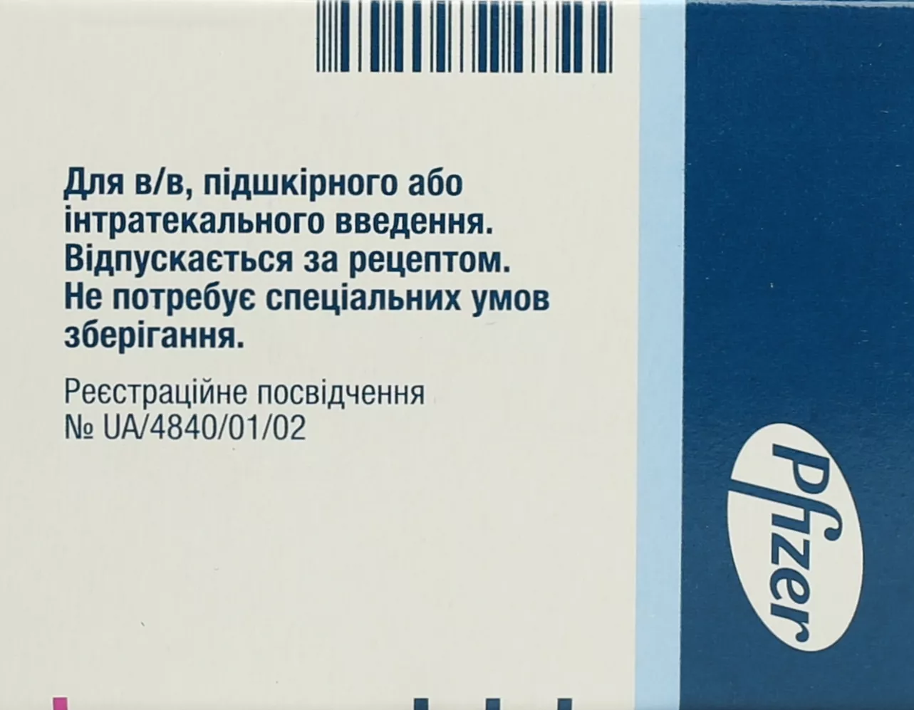 Лікарська форма. Ліофілізат для розчину для ін’єкцій.Основні фізико-хімічні властивості: білий або майже білий ліофілізат; розчинник: прозорий безбарвний розчин.