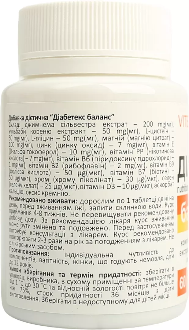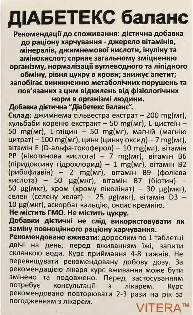 Состав: джимнемы сильвестры экстракт - 200 мг, одуванчика корня экстракт - 50 мг L-цистеин - 50 мг L-глицин - 50 мг, магний (магния цитрат) - 100 мг, цинк (цинка оксид) - 7 мг, витамин Е (D-альфа токоферол) - 20 мг, витамин РР (никотиновая кислота) - 7 мг, витамин В6 (пиридоксина гидрохлорид) - 1 мг, витамин В2 (рибофлавин) - 2 мг, витамин В9 (фолиевая кислота) - 50 мкг, витамин В7 (биотин) - 50 мкг, хром (хрома пиколинат) - 30мкг, селен (селена хелат) - 25 мкг, витамин D3 - 5 мкг, аскорбат кальция, окись кремния