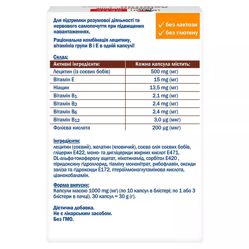 Раціональна комбінація лецитину, вітамінів групи В та вітаміну Е для підтримки розумової діяльності та психічного самопочуття при підвищених навантаженнях.
