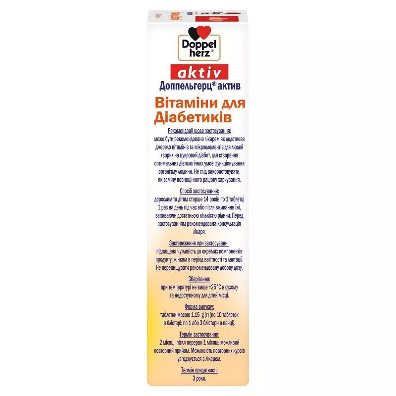 Вітамінний комплекс Доппельгерц® актив Вітаміни для діабетиків здійснює цілеспрямоване забезпечення організму спеціально підібраними для цієї мети вітамінами, мікроелементами та мінеральними речовинами. Розроблений у відповідності з урахуванням добової потреби хворого на цукровий діабет. Вітаміни, що входять до складу комплексу, сприяють покращенню обміну речовин, стимулюють імунологічну резистентність до дії різних мікробних агентів, підсилюють стійкість до несприятливих факторів навколишнього середовища. Нестача в харчуванні мінеральних речовин та вітамінів може стати одним з тригерних факторів розвитку важких ускладнень цукрового діабету. Внаслідок чого підвищується ризик виникнення ураження судин сітківки ока, ураження стінок судин нирок, а також підвищується ризик виникнення невропатій.