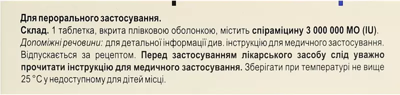 1 таблетка, вкрита плівковою оболонкою, містить спіраміцину 3 000 000 МО;