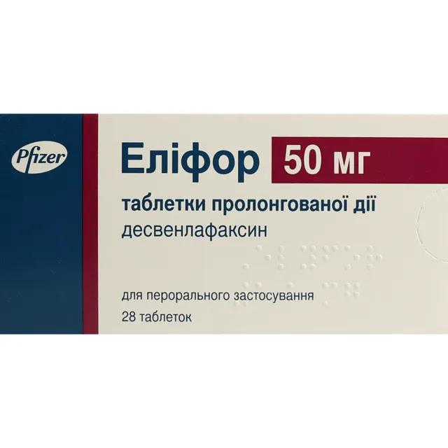Протипоказання.- Підвищена чутливість до десвенлафаксину сукцинату, венлафаксину гідрохлориду або до будь-яких допоміжних речовин у складі препарату Еліфор.