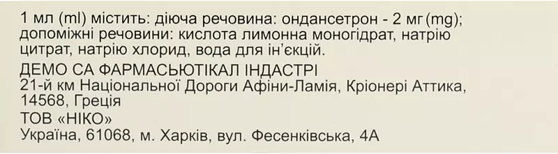 1 мл раствора содержит 2 мг ондансетрона (в форме дигидрата гидрохлорида);