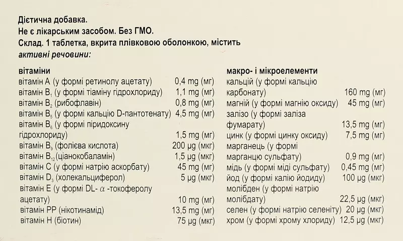 (рибофлавін) — 0,8 мг, мідь (у формі міді сульфату) — 0,45 мг, вітамін А (у формі ретинолу ацетату) — 0,4 мг, вітамін В9 (фолієва кислота) — 200 мкг, йод (у формі калію йодиду) — 100 мкг, вітамін Н