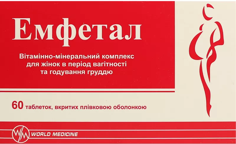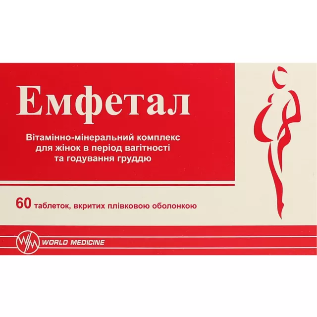 вітаміни та мінеральні речовини, що входять до складу дієтичної добавки Емфетал, повністю поповнюють їх дефіцит у разі підвищення фізіологічних потреб у період вагітності та годування грудьми, надмірних фізичних та розумових навантажень. Кальцій (у формі кальцію карбонату) необхідний для формування кісткової речовини, згортання крові, здійснення процесів передачі нервових імпульсів, скорочення скелетних та гладких м’язів, нормальної діяльності міокарда. Вітамін С (у формі натрію аскорбату) має виражені відновлювальні та антиоксидантні властивості. Бере участь в окисно-відновних процесах, у регуляції вуглеводного обміну, безпосередньо бере участь у метаболізмі тироксину, біосинтезі стероїдних гормонів та інсуліну. Вітамін С необхідний для нормального функціонування системи згортання крові, біосинтезу колагену, регенерації сполучної та кісткової тканини. Знижує проникність капілярів. Сприяє абсорбції заліза у кишечнику та бере участь у формуванні гемоглобіну. Підвищує неспецифічну резистентність організму та має антиоксидантні властивості, сприяє підвищенню опірності організму до інфекційних захворювань. Вітамін С у комплексі з вітаміном Е — антиоксиданти, які захищають жирові структури мембран клітин від перекисного окиснення. Магній (у формі магнію оксиду) бере участь у кісткоутворенні, передачі нервового збудження та нормалізації збудливості нервової системи. Має антиспастичні та судинорозширювальні властивості, стимулює перистальтику кишечнику та жовчовиділення, сприяє виведенню ХС із кишечнику, активує ферменти вуглеводного обміну тощо. Вітамін РР (нікотинамід) бере участь у процесах тканинного дихання, жирового та вуглеводного обмінів. Залізо (у формі заліза фумарату) бере участь в еритропоезі, у складі гемоглобіну здійснює транспорт кисню до тканин. Залізо входить до складу ферментів (пероксидази, цитохрому, цитохромоксидази тощо), що забезпечують процеси дихання клітин; входить до складу протоплазми і клітинних ядер. Вітамін Е (у формі DL-α-токоферолу ацетату) має антиоксидантні властивості, захищає внутрішньоклітинні ліпіди від пероксидації; підтримує стабільність еритроцитів, запобігає гемолізу; чинить позитивний вплив на функцію статевих та інших ендокринних залоз, діяльність м’язів, вітамінів A, D, бере участь в обміні білків та вуглеводів. Цинк (у формі цинку оксиду) є складовою більше ніж 80 ферментів організму людини. Необхідний для утворення еритроцитів та інших формених елементів крові. Бере участь у фотохімічних реакціях процесу зору та діяльності залоз внутрішньої секреції. Вітамін В5 (у формі кальцію D-пантотенату) бере участь в обміні вуглеводів і жирів, у реакціях ацетилювання, каталізує синтез білків. Регулює функції нервової системи, щитовидної залози, надниркової залози. Сприяє розвитку, регенерації епітелію та ендотелію. Вітамін В6 (у формі піридоксину гідрохлориду) як кофермент бере участь у білковому обміні та синтезі нейромедіаторів. Під час вагітності особливо необхідний жінкам, які в минулому приймали оральні контрацептиви, що могло призвести до вичерпування депо піридоксину в організмі. Вітамін В1 (у формі тіаміну гідрохлориду) як кофермент бере участь у вуглеводному обміні, функціонуванні нервової системи. Марганець (у формі марганцю сульфату): головна біологічна 