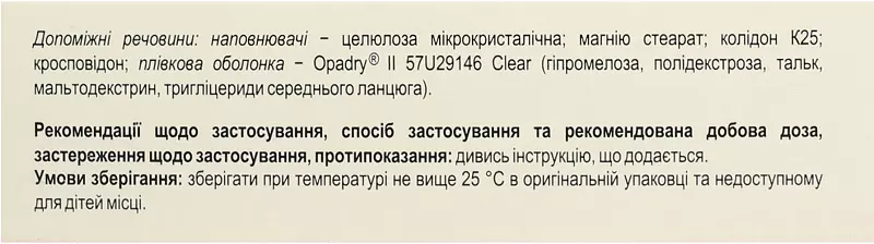 Допоміжні речовини: наповнювачі — целюлоза мікрокристалічна; магнію стеарат; колідон К25; кросповідон; плівкова оболонка — Opadry® II57U29146 Clear (гіпромелоза, полідекстроза, тальк,