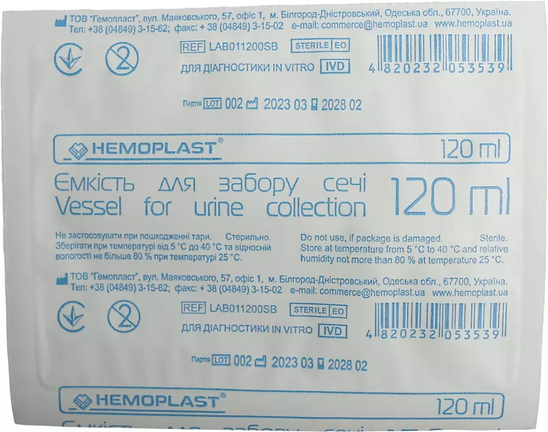 Емкость для забора мочи стерильная 120 мл, Гемопласт