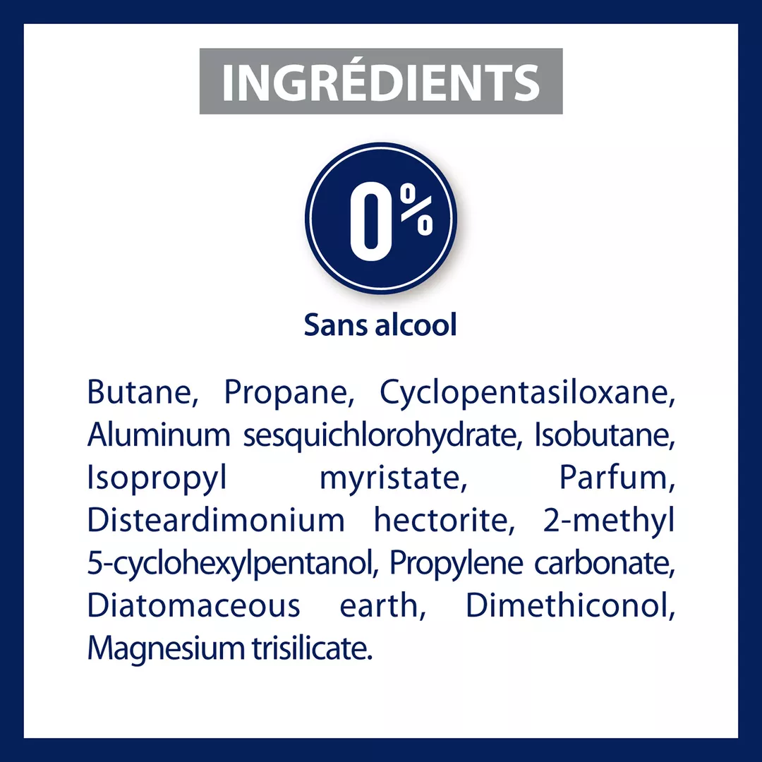 Butane, Propane, Cyclopentasiloxane, Aluminium Sesquichlorhydrate, Isobutane, Isopropyl Myristate, Parfum, Disteardimonium Hectorite, 2-Methy-5-Cyclohexylpanthenol, Propylene Carbonate, Diatomaceus Earth, Dimethiconol, Magnesium Trisilicate.