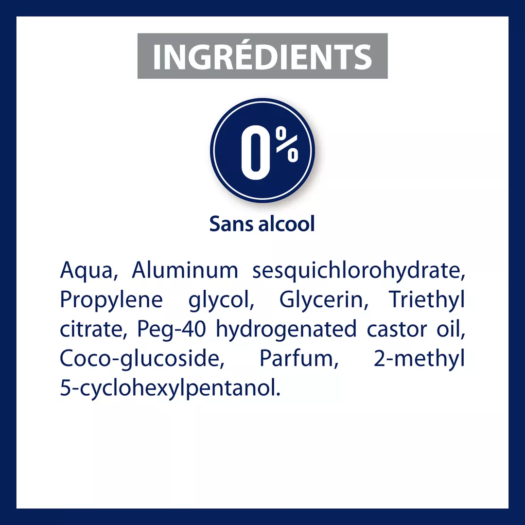 Aqua, AluminiumSesquichlorhydrate, PropyleneGlycol, Glycerin, TriethylCitrate, PEG-40 HydrogenatedCastorOil, Coco-Glucoside, Parfum, 2-Methyl-5-Cyclohexylpentanol.